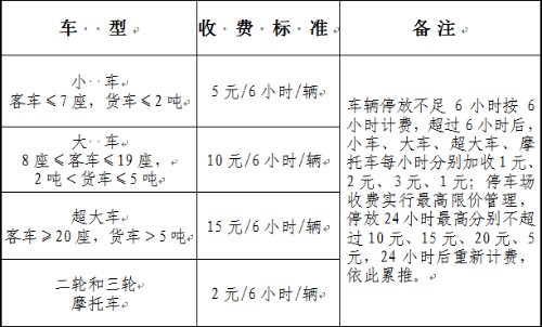 小車5元/6小時/輛,大車10元/6小時/輛,超大車15元/6小時/輛,摩托車2元/6小時/輛。