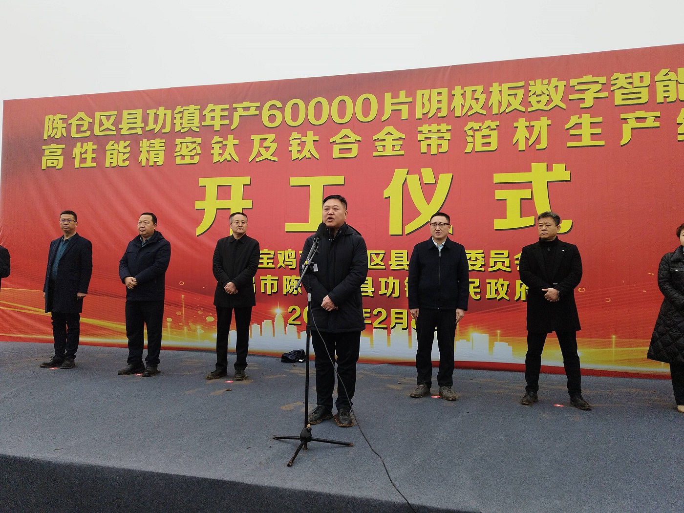 2月8日,陳倉(cāng)區(qū)在縣功鎮(zhèn)舉行年產(chǎn)6萬(wàn)片陰極板數(shù)字智能生產(chǎn)線、高性能精密鈦及鈦合金帶箔材生產(chǎn)線項(xiàng)目開(kāi)工儀式。