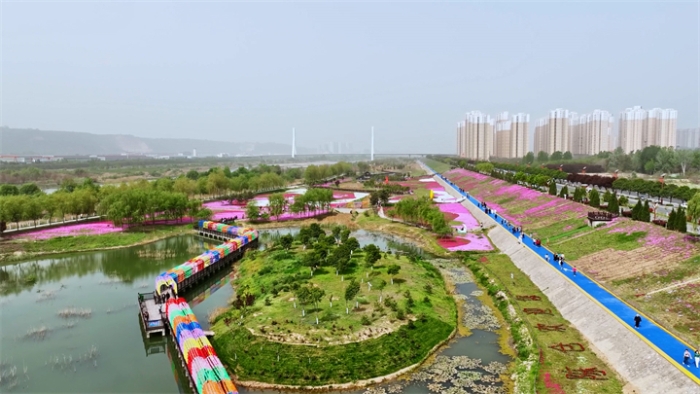據了解,陳倉區渭河生態治理工程是渭河百里畫廊的重要組成部分,芝櫻花海以“生態優先、水美陳倉”為建設理念,以“何尊為首,花海為媒,千水環繞,水潤陳倉”為目標,著力打造的城市核心生態區。花海中央建設防汛瞭望塔、印象廣場和自然生態湖。防汛瞭望塔以“何尊”為模型,突出“看‘中國’,來寶雞”的青銅歷史元素,引來千河清水蜿蜒貫通園區,涵養并塑造出“堤固、水清、路通、岸綠、景美”的城市景觀。修建貫穿整個園區的3000多米的木棧道,展示“明修棧道、暗度陳倉”的歷史典故。種植芝櫻花3萬多平米,形成規模化的花海景觀,其中點綴園林、廊橋、步道、湖心島等景觀小品。每年4月芝櫻花海全部綻放,絢爛多姿,宛若紅云,已成為市民賞花游玩的網紅打卡地,年吸引觀光游客超80萬人。