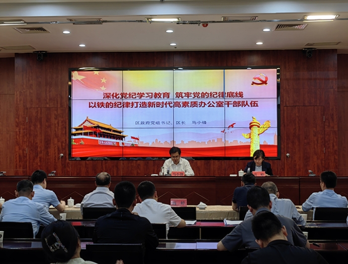 5月13日晚,區(qū)政府黨組書記、區(qū)長馬小鋒以“深化黨紀(jì)學(xué)習(xí)教育筑牢黨的紀(jì)律底線以鐵的紀(jì)律打造新時代高素質(zhì)辦公室干部隊(duì)伍”為題,為區(qū)政府辦公室全體干部講授黨紀(jì)學(xué)習(xí)教育專題黨課。區(qū)委常委、區(qū)政府黨組副書記、常務(wù)副區(qū)長高婷主持會議。