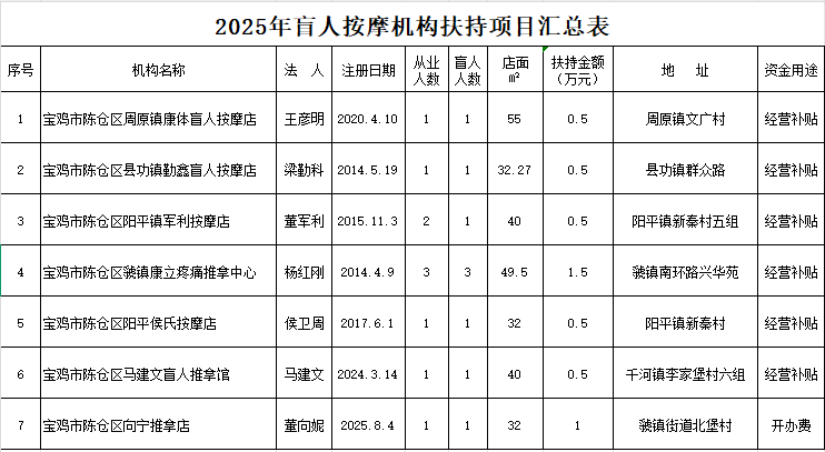 為落實《陜西省“十四五”規劃殘疾人保障和發展規劃》有關要求,根據市殘聯《2023年殘疾人就業增收項目實施方案》【寶市殘聯發〔2023〕15號】文件,大力發展盲人按摩事業,鼓勵、扶持、規范盲人按摩機構發展,按照“個人申請、村(社區)審批、鎮街審核公示上報”的程序,我區符合扶持標準盲人按摩店7個,從業視力殘疾人9人。現予以公示,公示期三天(10月10日-10月12日),歡迎社會各界監督。